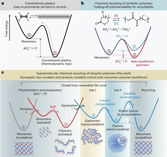 1.过去数年间,研究者通过开发大宗塑料废料的催化回收技术或重新设计具有本征化学可循环性的新一代环形聚合物,在可持续聚合物的化学合成路径上取得了长足进展。实现塑料闭环化学循环的关键在于将聚合物废弃物转化为原始单体的能力,这种能力可与机械回收形成互补,最终构建塑料的未来循环经济体系。然而,传统塑料经过数十年优化已实现聚合能力最大化——即通过吉布斯自由能变(∆Gp°)获得定量单体转化率,这反而使“热力学陷阱”材料的解聚过程天生具有高能耗特性。例如聚乙烯需要超过600℃的高温提供足够熵驱动力,以抗衡聚合过程中极高的焓变(∆Hp°),才能实现自发的聚合物-单体解聚(图1a)。