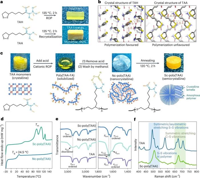 1.为验证这一独特策略,本文选用硫辛酸(TA)衍生物进行测试。这类分子以聚合能力著称,其结构兼具动态共价键与非共价键特性,可通过本体开环聚合(ROP)形成聚(TA)网络。然而实验发现,其伯酰胺衍生物硫辛酰胺(TAA)在本体状态下无法发生常规ROP反应。相反,TAA熔体迅速重结晶形成多晶固体,经核磁共振氢谱(图2a)证实其为TAA单体而非聚合物。这一反常现象促使我们以结构类似的硫辛酰肼(TAH)为参照分子(图2b),深入解析TAA的固态结构。结果表明:晶体中TAA通过伯酰胺键主导的超分子自组装形成特殊的1,2-二硫戊烷环交叉堆叠构型,该空间排列使单体单元相互隔离,从而抑制了开环聚合关键步骤——分子间二硫键交换,同时促进分子内闭环反应。作为对比,TAH晶体中1,2-二硫戊烷环呈现有序紧密排列(图2b),因而能按预期发生本体聚合(图2a)。本文推测:若能通过调控侧链氢键来操纵主链动态共价ROP反应,则有望获得动力学稳定的聚合物,这类材料可自发回收为热力学产物(即原始单体),实现闭环循环。