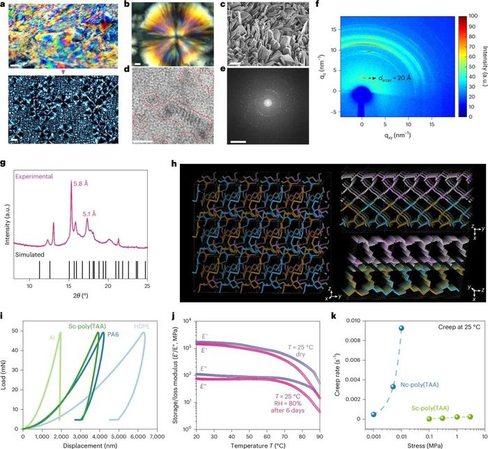 1.通过偏光显微镜(POM)观察发现,所得聚TAA薄膜体相中具有纳米晶域(图3a),但缺乏长程有序结构。因此本文尝试在120℃下对聚TAA进行2小时退火处理,以促进分子链迁移与重组,同时确保聚合物主链不发生明显解聚。退火后聚合物熔体重构形成高度结晶的球晶区域,POM显示其直径可达数百微米(图3a)。差示扫描量热分析表明Sc-聚TAA在90-125℃范围内存在多重熔融峰(图2d),热重分析显示其热分解温度达240℃。X射线衍射进一步揭示了退火前后材料有序度的差异,分别对应Nc-聚TAA(纳米晶态)与Sc-聚TAA(半晶态)。有趣的是,Sc-聚TAA与TAA单体显示出相似而不同的衍射峰,反映其氢键构型的相似性,衰减全反射红外光谱中Sc-聚TAA与TAA晶体高度一致的酰胺吸收峰进一步验证了该结论(图2e)。拉曼光谱证实了Sc-聚TAA的聚合物本质(图2f)。由此可见,该动态体系经退火处理后以半晶态聚二硫化物的形式被动力学捕获(图1c)。为区分Sc-聚TAA与Nc-聚TAA的氢键交联拓扑结构差异,本文测试了流变学曲线随温度的变化关系。结果显示Nc-聚TAA在20℃呈现典型热塑性玻璃化转变特征,而Sc-聚TAA因球晶域熔融从80℃开始出现软化阶段。这些实验数据共同证实了纳米晶与半晶态聚TAA材料的成功制备。
