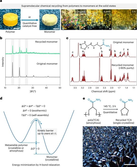 华东理工大学张琦教授、曲大辉教授和诺奖得主荷兰格罗宁根大学Ben L. Feringa 教授合作,提出“超分子化学回收”全新概念:利用侧链氢键自组装与主链动态二硫键的协同平衡,通过简单的溶胀/去溶胀循环即可在固态下实现聚合物—单体可逆转化。所得聚(硫辛酸酰胺)兼具高达3.9 GPa的杨氏模量与120 °C无溶剂定量解聚为>90%纯度晶态单体的能力,循环再生后材料性能无衰减,生命周期评估显示碳足迹仅为传统溶剂法的1/180,为闭环回收型高性能塑料提供了可扩展的超分子解决方案。相关论文以“Supramolecular chemical recycling of dynamic polymers”为题,发表在Nature Nanotechnology。