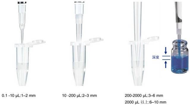 2)吸头浸入深度:(如下图)正确的吸头浸入深度可以有效的减少取液误差。